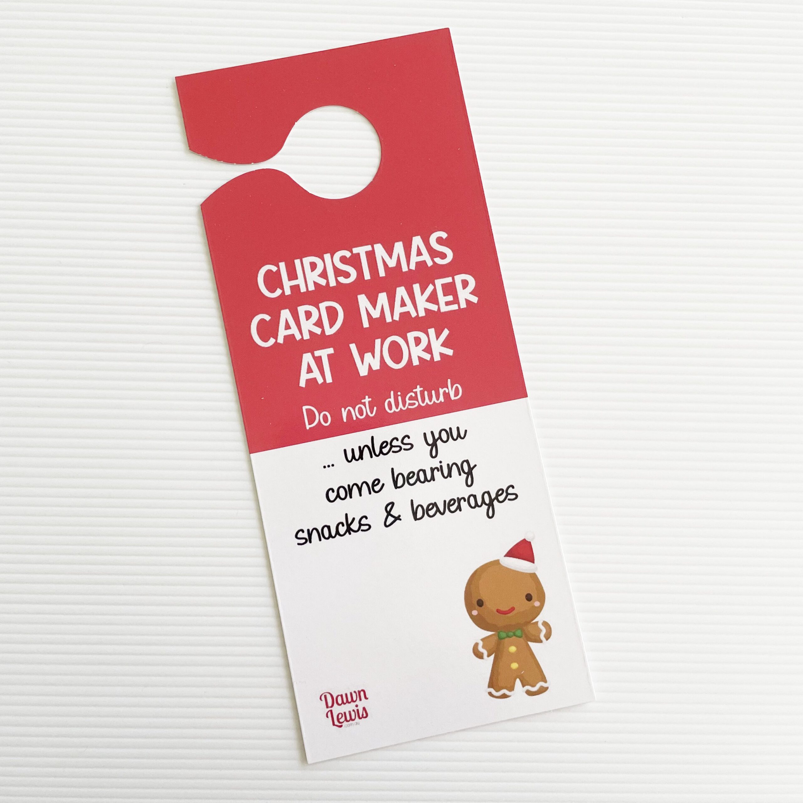 The Craft Room Door Hanger was designed by me as part of the Christmas Cards on Time Box. This glossy door hanger is double sided, with one side discouraging visitors, and the other side welcoming them in.